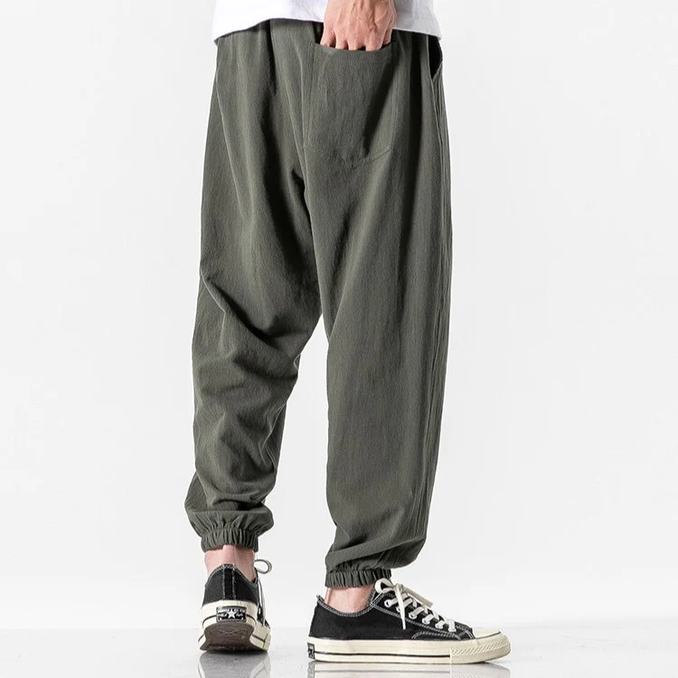 Japanese-inspired harem pants. Featuring an elastic waistband, ribbed cuffs, agleted drawstrings and deep hip pockets.