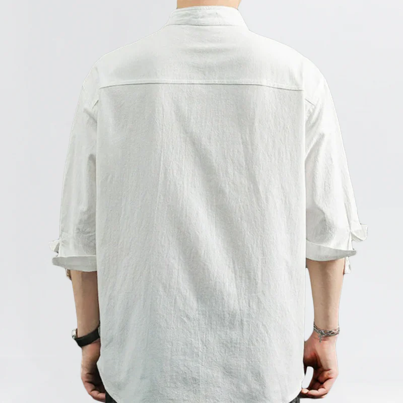 Featuring an oriental collar, three quarter length sleeves, a breast pocket, six buttons, and high quality linen construction.